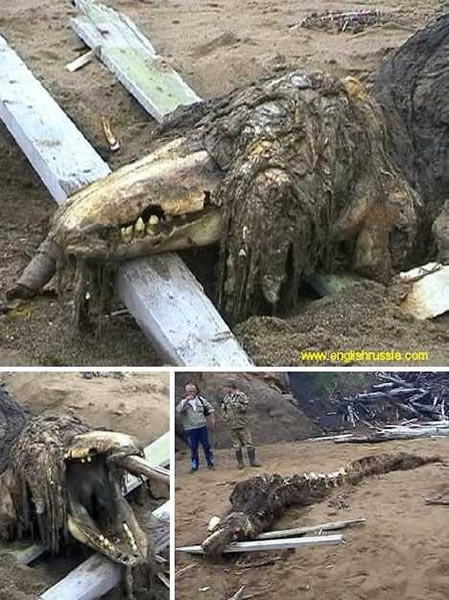 美国出现了蒙托克怪兽,在俄罗斯库页岛也曾出现一种怪异的海滩怪物尸体。这具尸体高度腐烂,是2006年在俄罗斯远东库页岛上被当地驻扎士兵发现的,随后俄罗斯特务人员很快转移了这具海滩尸体进行“深度研究”,虽然5年之后仍未听说关于它的官方评论,但一些独立调查员通过分析照片认为它是被冲到海岸的逆戟鲸或者大白鲸的头骨和骨骼。