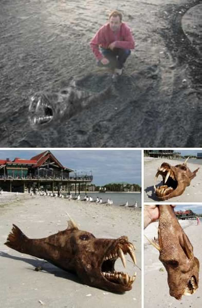 列举的一些海滩冲积生物都不是完整的,但是蒙托克怪兽却除外。报道称这种外形凶恶的动物尸体来自纽约长岛远东海域,是于2008年7月发现的,随即引起互联网热议。