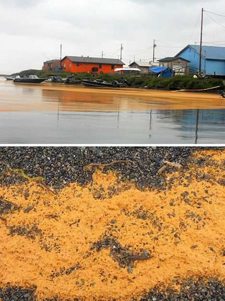 美国阿拉斯加州西北部楚科奇海滨偏远的基瓦利纳海域之前未被认为是外星人可能出现的地点,但是2011年8月3日发生了变化,在海边蔓延着数英里长的神秘生物,它们并不是小绿人,而是数十亿计的橙色孢子。
