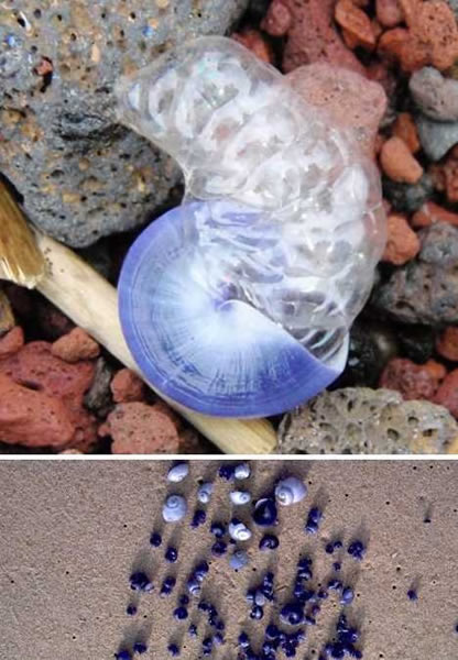 紫色暴风螺的学名为“Janthina janthina”,很少能被人们发现,有时它们会冲到岸边。这些精致而美丽的腹足动物长着超薄的外壳,通过透明的壳质“泡筏”能够漂浮在海面上。之所以被命名为紫色暴风螺是因为它们有时会被强烈的风暴吹至海岸。
