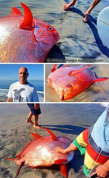 这是海滩上出现的一种美丽的红色鱼,它有点儿像月鱼,但又不完全像,有人称它为翻车鱼,人们很少能观看到这种深海鱼类,即使生物学家和钓鱼者一直在寻找它们。