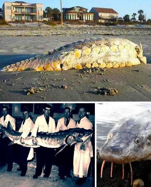 2012年3月份,美国南卡罗来纳州福利海滩上出现一种令人惊奇的神秘生物,被称为“恶梦级海怪”。从外形上它颇似鱼类,但又与现存的其他生物不一样,仿佛是从恐龙时代穿越时空到来的神秘生物。当地一位兽医检查了这个怪兽的鳞片,认为这可能是一条任性的大西洋鲟鱼,通常这种鱼的体长可增长至5米,重量达到800磅,自从大约1亿年前进化以来,并未发生太大的变化。