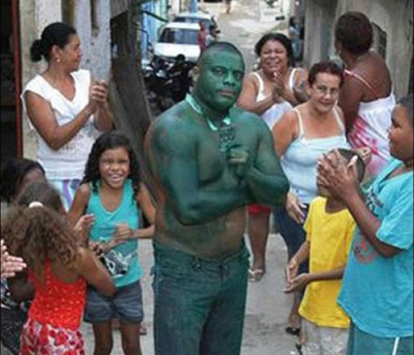这个男子名叫保罗·席恩里克·桑托斯(Paulo Henrique dos Santos),现年35岁,来自里约热内卢的维拉克鲁塞罗(Vila Cruzeiro),是一名游泳池服务员和电台主持人。在参加一次赛跑活动时,桑托斯决定将自己打扮成绿巨人。