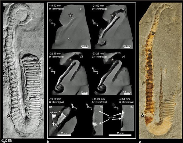 科学家称,CT扫描通过对化石样本的逐层扫描,能够获得人类肉眼观看更多的信息。他们还发现这种生物的身体上覆盖着3-4毫米长的穗状突起,博物馆一位发言人称,发现的这种生物化石是一种菊石物种。CT扫描和复杂的3D重塑程序不仅能够再现这一生物的真实外观,还能获得它们通过四肢运动的身体移动状况。