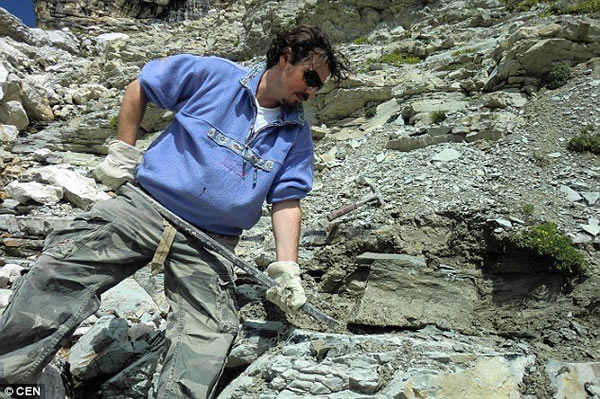 亚历山大-卢克内德尔在阿尔卑斯山脉多洛米蒂山顶挖掘“史前海底沉积物”。
