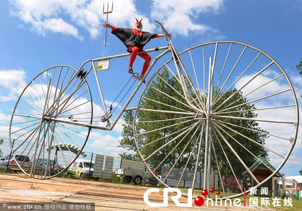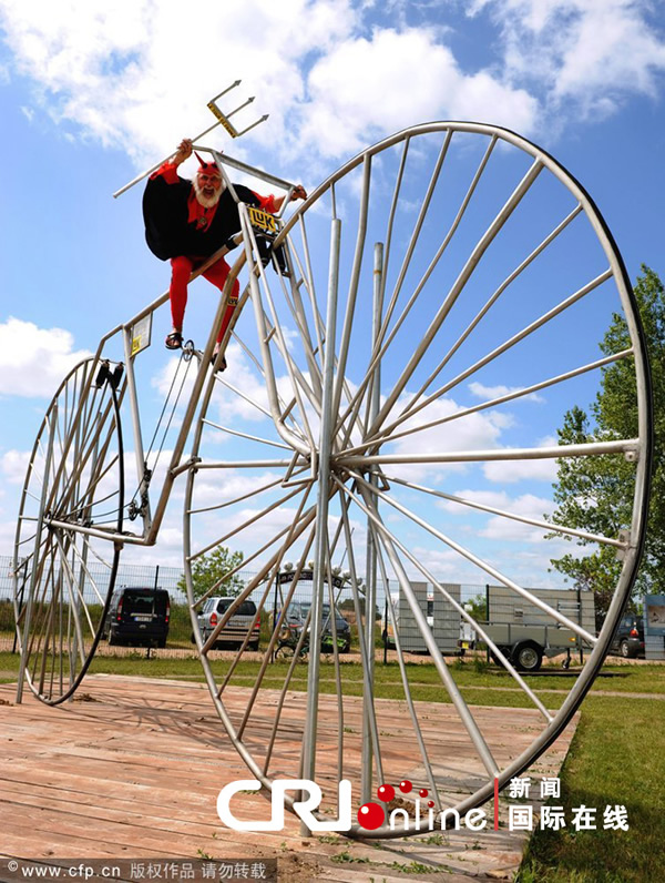 世界上最大的自行车亮相德国 来源: 神秘的地球 时间:2012年6月03日 12:58 世界上最大的自行车亮相德国 世界上最大的自行车亮相德国 当地时间2012年6月1日,德国Pudagla,自行车设计师Dieter (Didi) Senft坐上他设计的“世界最大的功能自行车”上。这辆自行车长7.8米,高3.7米,车轮半径为3.32米,重150千克。至今,设计师Dieter (Didi) Senft已经获得了17项吉尼斯纪录。这辆自行车将参加乌瑟多姆岛Pudagla举办的“世界发明”展。 国际在线 上一篇 下一篇 TAG: 德国 自行车