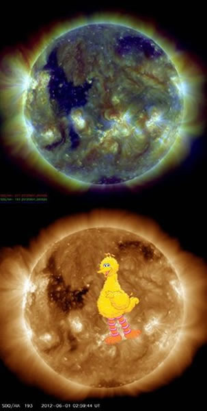在美国宇航局太阳观测卫星最新拍摄的这张照片中,太阳表面显示出的巨大形状酷似少儿电视节目“芝麻街”中的心爱大鸟。