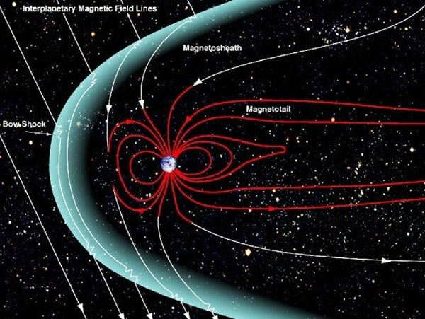 太阳风是太阳表层大气向周围宇宙空间发出的高速带电粒子流,这些等离子体以每小时一百万英里的速度向地球袭来。当它们抵达地球磁场时,可产生令人惊讶的“电磁风暴”,特别是快速、密集或者来势汹汹的太阳风可扰乱地球磁场,导致轨道卫星、地面电网和通信系统失灵。但是地球磁场具有天然的“抵抗能力”,如同一个巨大的“泡沫”笼罩着地球,将太阳风高速带电粒子流退挡回宇宙空间。