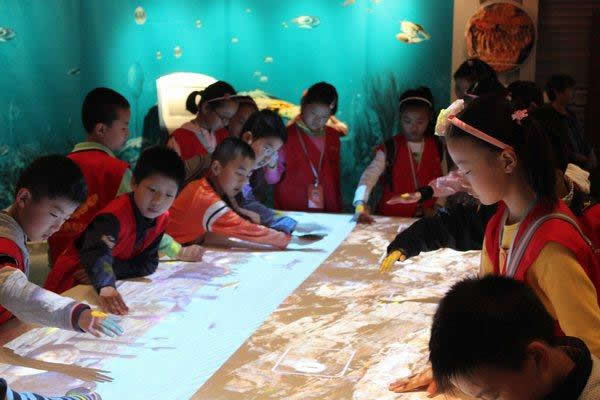 多点触摸人机交互系统是博物馆近年来取得的又一项重要的科普互动项目成果。这一系统采用多点触控技术、投影技术、计算机图形、光电成像、融合显示、多传感器、图像处理、计算机音效等技术以及硬件设备,构成了能使十个人同时在台面上进行人机交互的操作系统。它免去了鼠标和键盘工具,直接通过手感应实现操作。