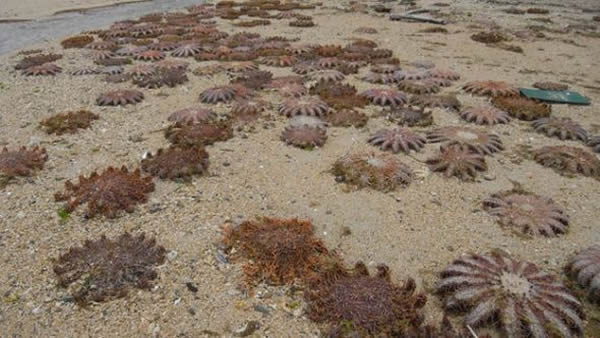 日本石垣岛海洋学家发现大量的棘冠海星搁浅于沙滩上