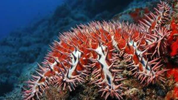 这些多触手的海星因为它们身上长满的保护性毒素针刺而命名,因为它们整个看起来像一座皇冠。它们挤压自己的腹部,使腹部突出来进行捕食,它们用分泌的消化液来将食物消化掉,然后吸收掉它们需要养分。一只成年棘冠海星一年可以“吃掉”大约6平方米面积的珊瑚礁。