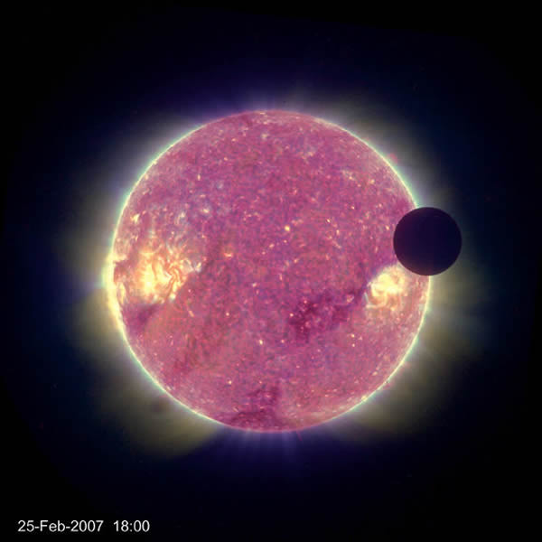 这是月球从太阳前面经过的情景,图像由美国宇航局的STEREO-B探测器于2007年2月25日拍摄。在这张照片中太阳采用伪彩色,月球就是右上角的黑色圆形物体。STEREO项目包括两艘飞船,于2006年10月发射升空,用于太阳风的观测研究。