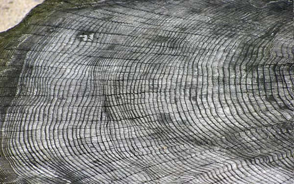 科学家对两棵日本雪松的年轮(如图所示典型的树的年轮)的研究显示,公元774到775年,大气中放射性碳14的含量跃升了1.2%,这一研究成果刊发在今天《自然》杂志的网络版上。这表明,宇宙射线——来自太空的高速带电粒子——曾经轰击了我们的星球,而且它们和大气中的氮14发生反应,将其转化成碳14。