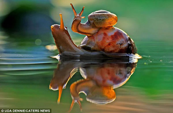 这一美妙动物照片是33岁印尼摄影师犹达-丹尼尔拍摄的,他是在巴淡岛自己家附近拍摄到这一幕。他说:“当我观看到婴儿蜗牛爬在妈妈外壳上感到非常吃惊,我从未看到过这样的情景和行为。”