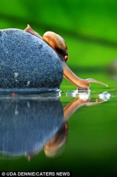 蜗牛十分怕水,摄影师丹尼尔只拍摄到一次它接近水面,当时只是去饮水