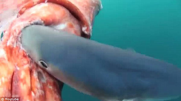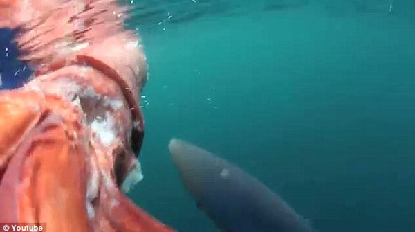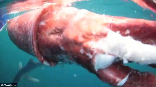 这条超级大鱿鱼如此之大以至于麦克格拉尚无法一人将其拖上船,只能拍下鲨鱼吞噬鱿鱼的视频。