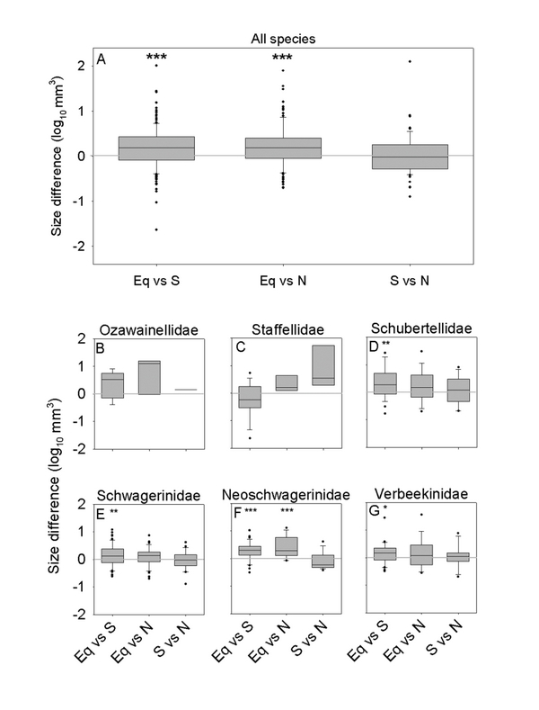 针对这个问题,中国科学院南京地质古生物研究所晚古生代创新团队成员张以春副研究员与美国斯坦福大学Jonathan Payne博士合作,在自建的蜓类有孔虫数据库中,选取中二叠世分布于特提斯洋的42个地块(地区)中的6646个样品进行了统计分析。研究结果表明,位于赤道区的蜓类分子的大小明显大于位于南北过渡带的分子,而且这种个体上大小的差异是由种内差异所决定。特别是旋壁中具有蜂巢层的分子如新希瓦格蜓类,表现最为明显。颇有意思的是,在时间序列上,晚古生代的有孔虫个体大小与海水中的含氧量呈正相关,按此理论推断,过渡区的蜓类理应比赤道区的个体大,但本研究却得到相反的结论,由此可见,海水中的含氧量在空间上并不是控制蜓类有孔虫大小的因素。综合分析研究认为:蜓类有孔虫旋壁中可能含有的藻类共生体、不同纬度区的季节性、不同纬度区海水中碳酸钙的溶解度可能是影响蜓类有孔虫在空间上个体大小差异的主导因素,同时也表明生物个体大小在空间和时间上可以有不同的控制因素。