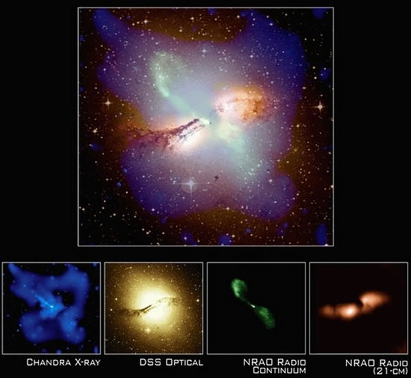 半人马座A星系也被科学家们称为NGC 5128,在光学望远镜的图像中,我们可以明显地看出一个大尺度的椭圆形恒星群,周围分布着大量的尘埃结构,形成了一圈厚厚的尘埃环。但是,正是由于这圈异常厚实的尘埃环,天文学家们无法通过可见光波段的望远镜观察星系内部所发生的事件。由于工作在可见光波段的望远镜无法洞察其中的现象,天文学家们使用了其他波段的光观察星系中央的活动情况。根据最新的红外天文望远镜观测结果显示,在半人马座A星系中存在恒星形成的痕迹,而射电望远镜和X射线望远镜的观测结果表明在星系中央发现了黑洞活动的影响。