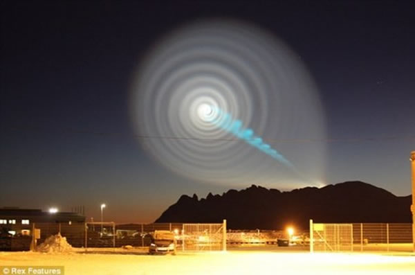 据英国每日邮报报道,6月7日晚8点45分,以色列等5个国家数以千计的居民都发现空中出现了奇特的“轮转烟火”光圈,有人声称这可能是来自外星球的神秘UFO,但事实上这是俄罗斯军事发射失败的测试火箭。