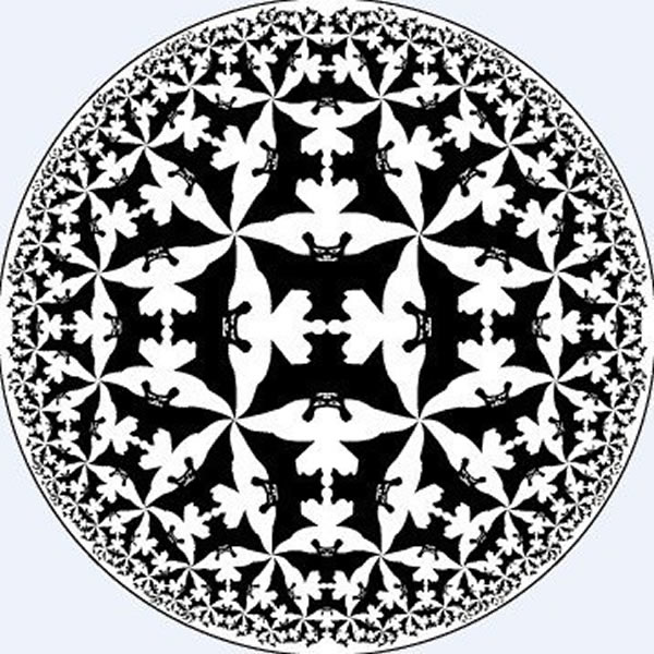 比如,在“圆形极限IV”图案中,周期性出现的连续图案环环相扣,重复连接形成了一幅由中心至边缘的无限延展图形,从二维的平面图案可以看出中心至边缘的连续图案以相同的收缩系数缩小,并在边缘位置区域无限,但是这样的图形在双曲空间中却是另一番景象:从中心至边缘,环环相扣的重复图案大小并没有缩小,而是相同的。由于双曲空间并不能平铺,我们就会在双曲空间的多维图形中看到扭曲的样子,就形成了类似绵延山峦波浪式起伏的景象。