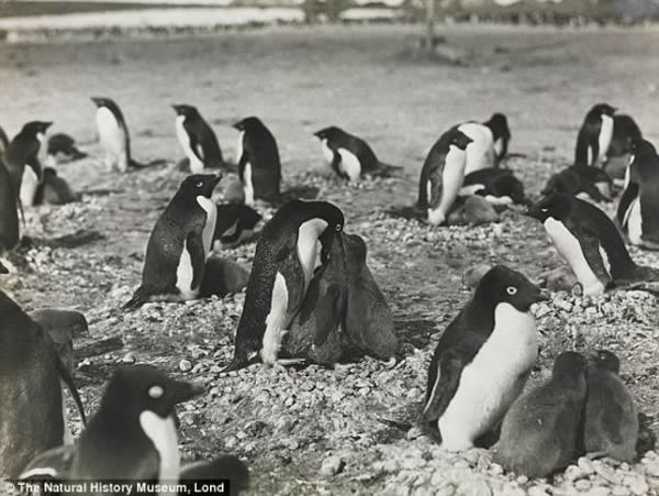 探险队外科医生莱维克博士100年前在南极地区进行艰险之旅时拍下这张阿德利企鹅的照片。