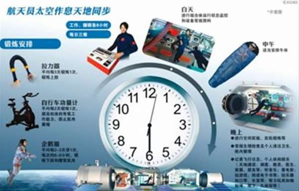 神九飞天入轨后,航天员随即按照计划开展了一系列活动。飞船进入第二圈后,景海鹏起身,打开轨道舱舱门。返回舱的舱门开关采取就近原则,坐在中间的航天员起身打开舱门比较方便。进入轨道舱后,航天员脱掉白色航天服,换上蓝色的工作服。