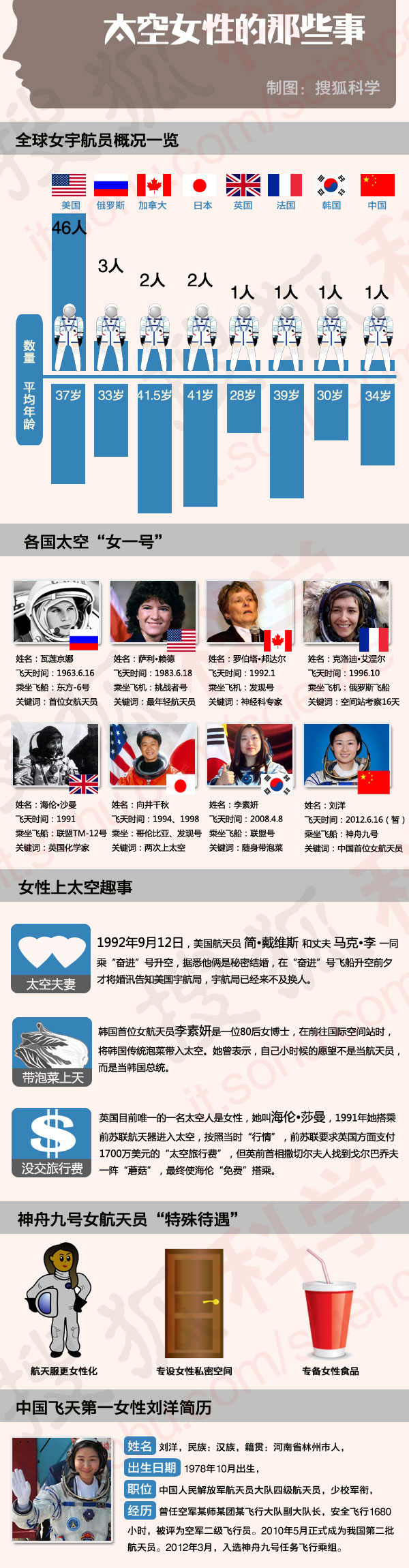 图说进入太空的女性宇航员 来源: 神秘的地球 时间:2012年6月18日 10:17 6月15日,中国载人航天工程新闻发言人宣布,神舟九号飞船定于6月16日18时37分发射,景海鹏、刘旺、刘洋执行此次载人交会对接任务,至此,刘洋成为我国首位飞天“神女”。刘洋,女,汉族,河南省林州市人,现为中国人民解放军航天员大队四级航天员,少校军衔,2012年3月入选神舟九号任务飞行乘组。都有多少女性航天员入过太空?各国的首位女航天员是谁?神九为刘洋安排了哪些特殊待遇?……此图为您一一盘点。 上一篇 下一篇 TAG: 宇航员