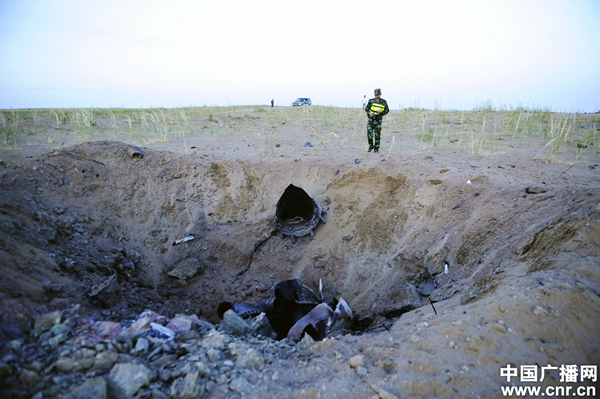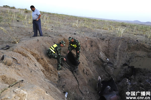 “神九”载人飞船发射逃逸塔残骸在巴丹吉林沙漠无人区找到