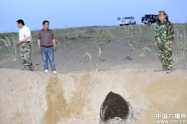 昨晚9点10分,在神舟九号飞船发射2个半小时之后,飞船主要组件逃逸塔在阿拉善盟边防支队干警和警民联防队员的共同努力下,在巴丹吉林沙漠腹地找到。目前残骸已被看护起来,等待送回到酒泉发射中心。