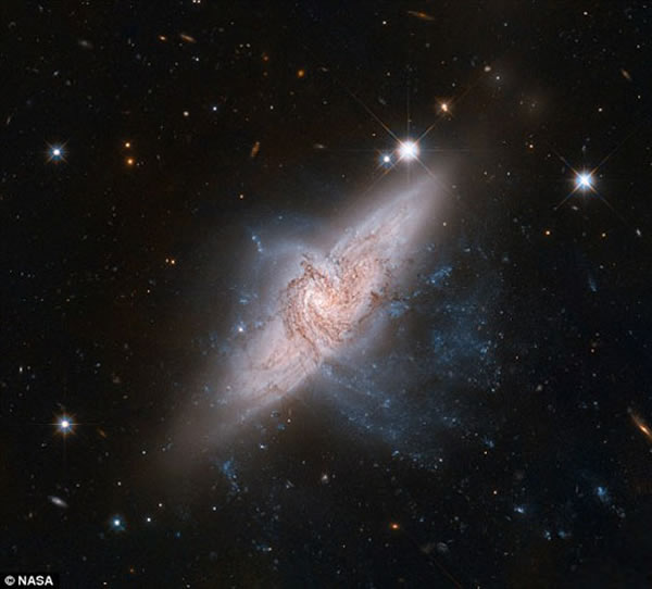 然而,在这NGC 3314星系的例子中,我们的确能在前景星系NGC 3314A中发现一些变形,但这几乎肯定是误导。星系NGC 3314A的变形主要表现在星系核心的右下方,这里有大量炽热的蓝白色恒星从其旋臂中延伸开来。这并不是由于它和背景星系NGC 3314B发生了相互作用,很可能是与其邻近的另一个星系NGC 3312或另外的一个邻近星系发生着潮汐作用。