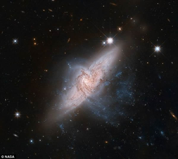 美国宇航局公布了一幅令人感到惊讶的图像,展示了NGC 3314A和NGC 3314B星系。这两个星系虽然相隔数千万光年,但在图像中却似乎猛烈撞到一起。这幅图像所用照片由哈勃太空望远镜拍摄,总的曝光时间超过一小时,拥有令人吃惊的细节。