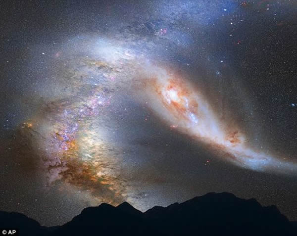 宇航局公布的一幅图像,展示了银河系(左)与附近仙女座星系在大约40亿年后发生撞击的景象