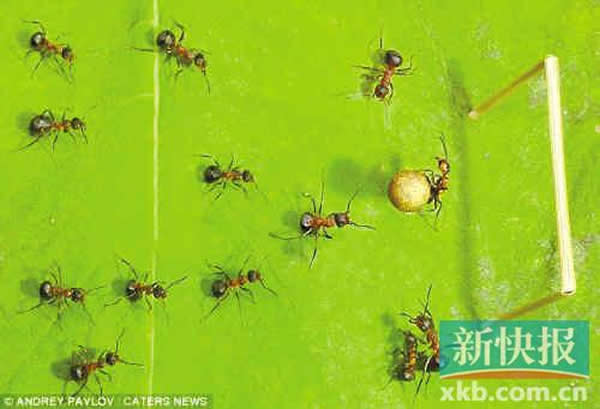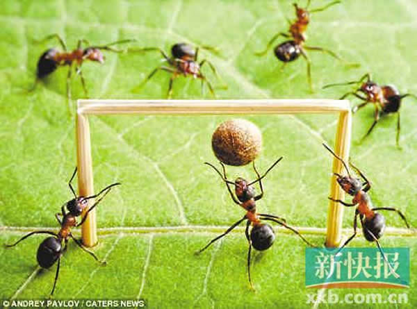 据英国《每日邮报》报道,俄罗斯摄影师安德烈·巴普洛夫借蚂蚁当“模特”,拍摄了一组有关欧洲足球锦标赛的照片。照片清晰度之高、“模特”动作之默契,令人颇为赞叹。为了借蚂蚁搬运物品的“本领”模拟与足球有关的动作,安德烈用稻草搭建了一个类似球门的门框,用树叶当作绿茵场。通过微距镜头,安德烈耐心地拍摄了数个小时,才将这些复杂精巧且难得的瞬间给记录了下来。可喜的是,照片非常成功,蚂蚁真的好似在“踢足球”。