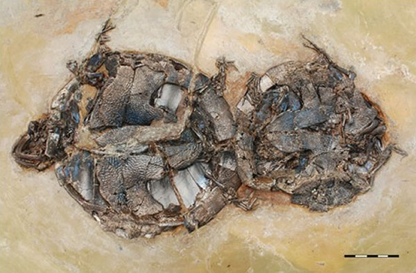 近日,德国古生物学家们“当场抓获”了拥有4700万年历史的无盾龟(Anosteira crassesculpta)化石,引人注目的是,这些龟化石代表18个个体,且两两成对。它们是在交配的过程中不幸落入有毒的水里,以拥抱的姿势保持了数千万年。这是人们首次发现保持交配状态的脊椎动物化石,相关研究发表在《生物学通讯》(BiologyLetters.)杂志上。