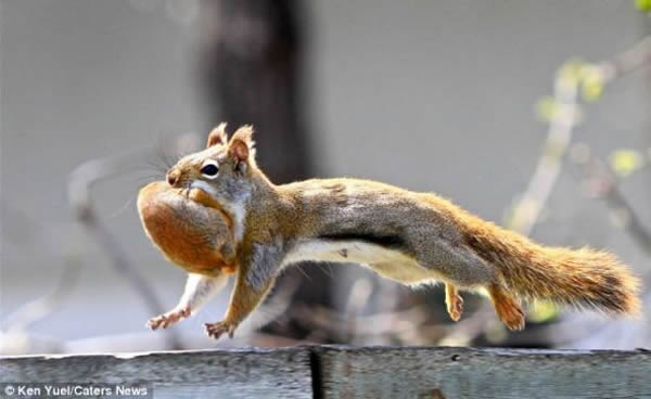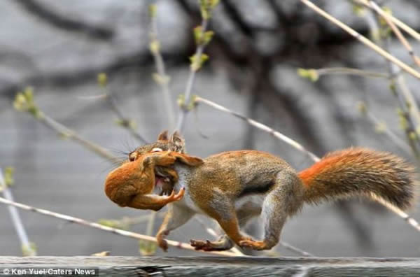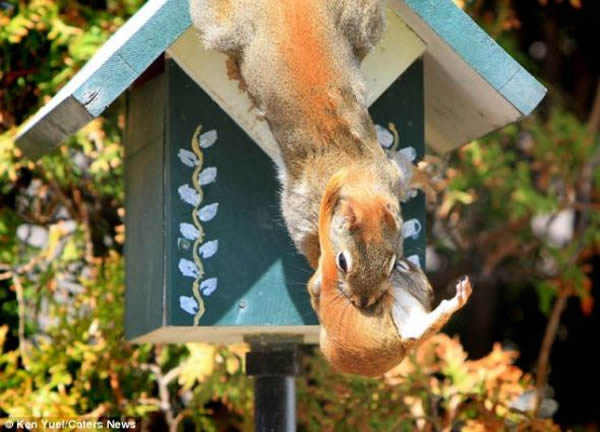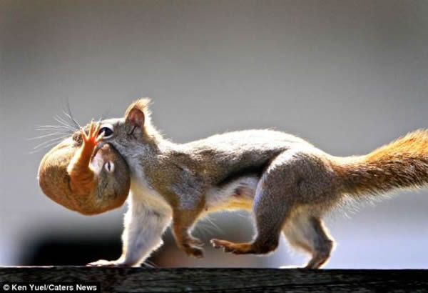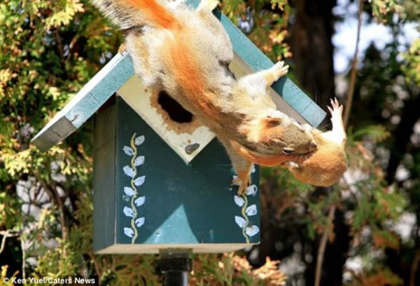 在自家的花园,加拿大摄影爱好者肯-尤尔拍摄了一组照片,展现松鼠妈玛叼着孩子搬新家的精彩瞬间。尤尔表示:“有一天,我发现一只红松鼠钻进我建的小鸟房,而后生下一窝小松鼠。不过,松鼠妈妈显然不喜欢我在它的新家附近走来走去——因为我要在院子里干活——于是决定搬家。”