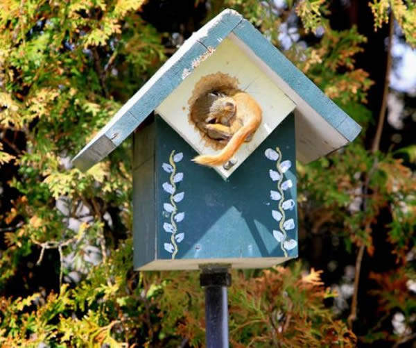 红松鼠妈妈叼着孩子钻出鸟房的小洞,而后搬往新家