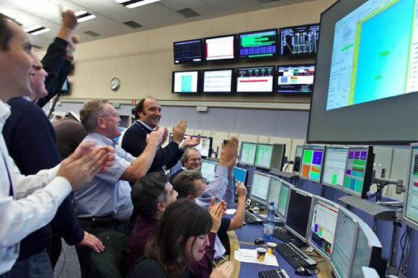 欧洲核子研究组织(CERN)提供的一幅照片,展示了2009年科学家在日内瓦的CERN任务控制中心庆祝重启大型强子对撞机的情形。CERN宣布将于7月宣布大型强子对撞机是否发现神秘莫测的上帝粒子