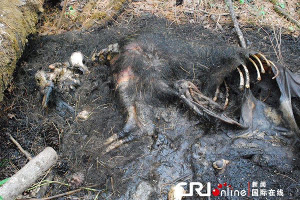 2012年6月12日,吉林长白山,左下角为含有毒饵的松塔堆,由于毒性剧烈,这头熊吃完立即倒毙。