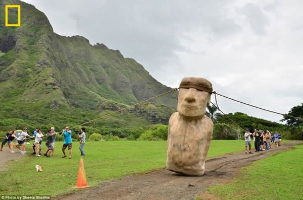 为了了解古人如何运输巨石像,志愿者制造了一个模型。模拟过程在夏威夷郊外进行。研究人员并不认为古人采用的就是这种方式,但同时也指出这种方式符合岛上居民口口相传的巨石像“走到”目的地的说法。在复活节岛上,他们发现道路两旁布满碎石,这也支持了他们的理论。这些碎石可能是运输过程中从巨石像上脱落的。
