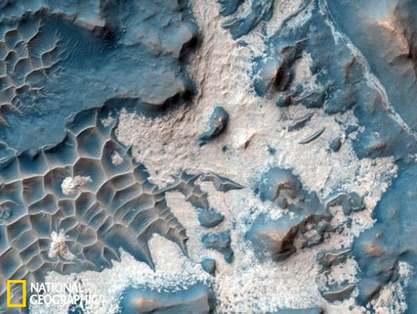这张最新公布的图像是由美国宇航局的火星勘测轨道器拍摄的。该探测器获取的其它数据表明这些明亮的物质是含水的,也就是说,在其原子结构中含有水分。科学家认为这些含水物质可能是在很久之前形成的,可能是由于地下水上涌或是由于附近火山的热量引发表面冰雪消融过程中造成的结果。