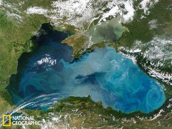 这张照片是美国宇航局的“大地”卫星拍摄的,可以看到在黑海海面上漂浮着一些蓝绿色的区域,这是浮游生物大爆发的现象。这样的场景在黑海每年都会发生,尤其是在夏季。水域呈现的颜色也随着这些微小生物的数量而发生相应的变化,这取决于营养物质的多寡,水温以及其它一些因素。