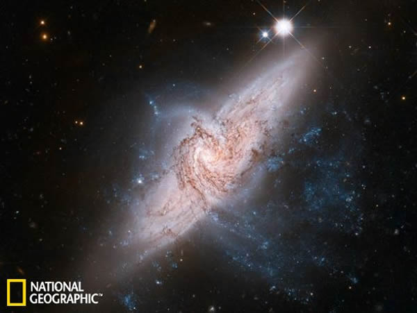这张照片由美-欧合作运营的哈勃空间望远镜拍摄,看上去似乎是两个正在相互撞击的星系,但是天文学家们指出,事实上这只是视觉假象,这两个星系相互之间实际上相距数千万光年。