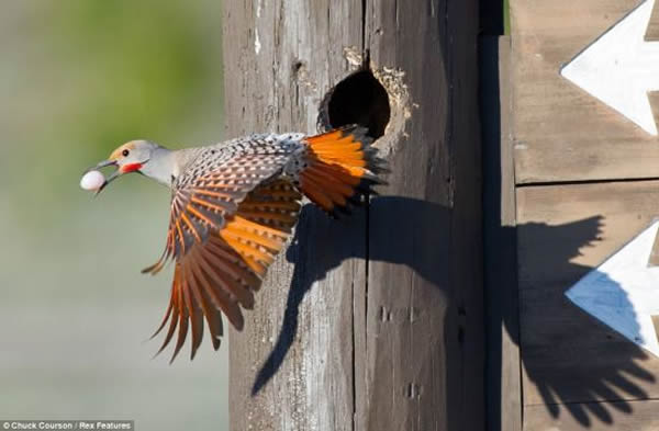 一对欧椋鸟夫妇对这对北扑翅鴷夫妇在黄石国家公园的家构成了威胁。摄影师拍到,它们受到外来者的欺负后,只好把一个白色小蛋转移到新巢穴。摄影师查克-库森解释说:“在一个十字路口,有一个很大的木牌。有一天我开车缓慢经过这里的时候注意到一只北扑翅鴷落在这指示牌上。我把车开到路边,近距离观察,发现这只具有开拓精神的小鸟和它的配偶在这个路标内雕刻出一个完美的巢穴。虽然在这个邻近地区有美洲野牛和麋鹿,我还是支起三角架,兴冲冲地用相机拍下了这些北扑翅鴷从巢穴飞进飞出时的精彩瞬间。”