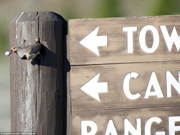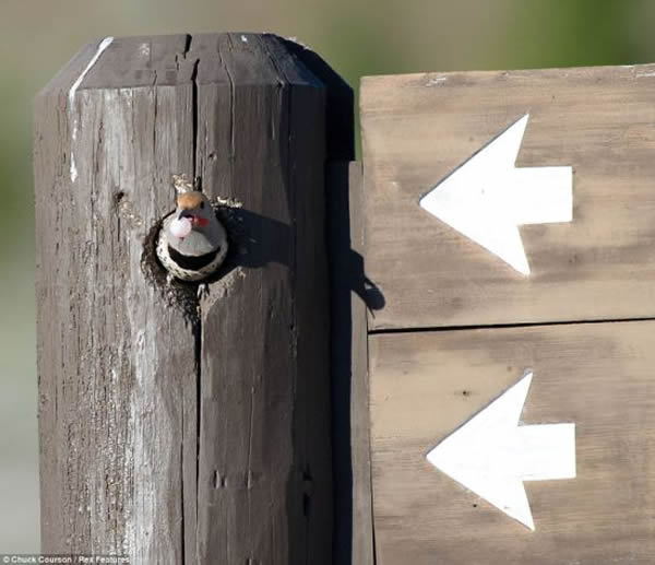 拍到这些惊人照片的摄影师库森说,他发现这只具有开拓精神的小鸟和它的配偶在黄石国家公园一个十字路口的路标内雕刻出一个完美巢穴。