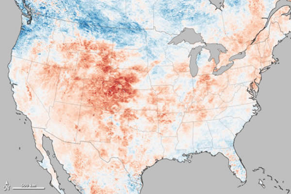 在这幅地图中,地表温度高于平均温度的地区以红色显示,接近正常温度地地区以白色显示,低于平均温度的地区以蓝色显示。其中,科罗拉多州的高温现象最为突出。