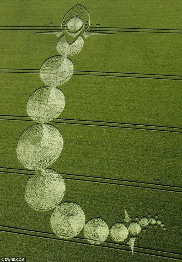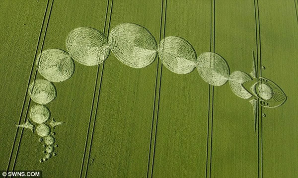 英国威尔特郡出现一个神秘的麦田怪圈,蛇一般在麦田中穿行,长度达到350英尺(约合106米)。这个麦田怪圈被称之为“金星太阳鱼”,据说展示了金星凌日过程。