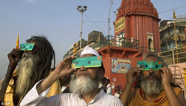 印度瓦腊纳西的恒河岸边,印度教信徒使用特制的纸板日食眼镜观赏金星凌