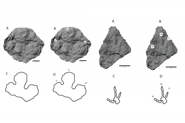 阿拉斯加新发现的两种恐龙足迹化石,左边为鸭嘴龙类,右边为兽脚类恐龙(Tony Fiorillo供)