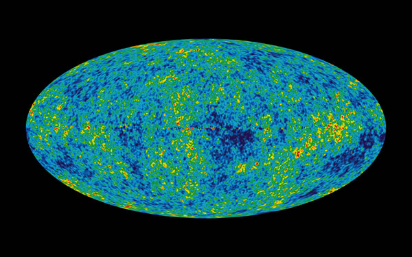 尽管宇宙大爆炸发生在很久以前,但是其影响依然存在,因为来自大爆炸的光子弥漫于整个太空,并且构成了宇宙微波背景辐射(如图所示)。