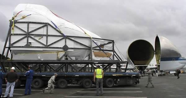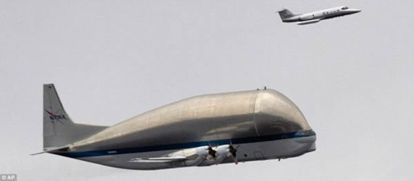 美国宇航局的“超级虹鳉”货运飞机,正在运送航天飞机训练机的机组人员舱